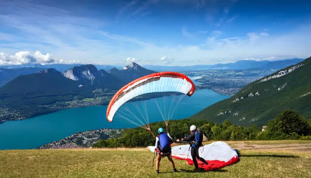 Les premiers pas dans le monde du parapente suivent une chorégraphie millimétrée. Le décollage depuis Doussard ressemble plus à une valse lente qu’à un saut dans le vide. Les pieds quittent le sol avec la même douceur qu’un danseur s’élève sur pointe.